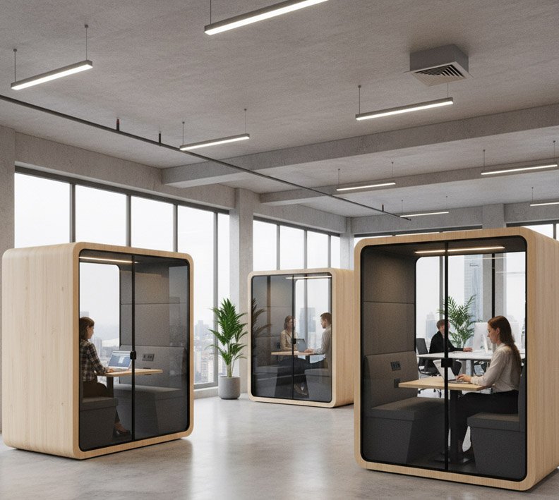 Custom-made acoustic pods for focused work or meetings. Integrated with lighting, ventilation, and power modules, these booths ensure privacy and acoustic comfort in open environments.