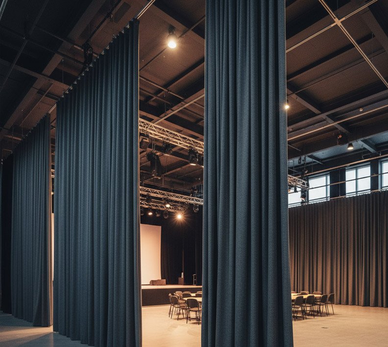 Flexible, sound-absorbing curtains made from dense acoustic fabrics. Provide visual separation, noise control, and blackout functionality in multi-purpose and performance spaces with customizable designs and easy installation.